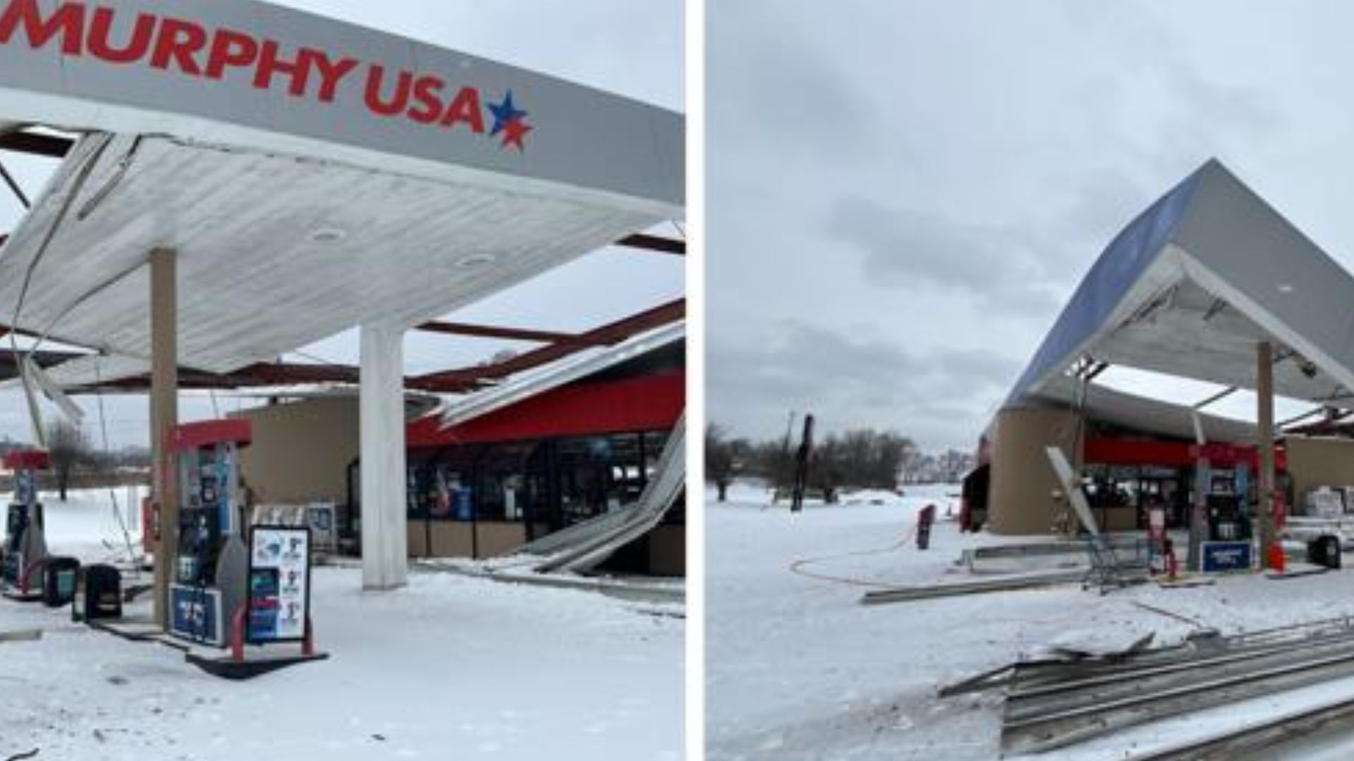The gas station’s collapsed awning has rendered it temporarily inoperable. Drivers are advised that “for now, it’s safe to assume that you won’t be able to get gas at this station for a while until things are repaired!” Murphy USA has not yet released a timeline for when the station will reopen or the repairs will be completed, but crews are expected to assess the damage as soon as conditions allow.