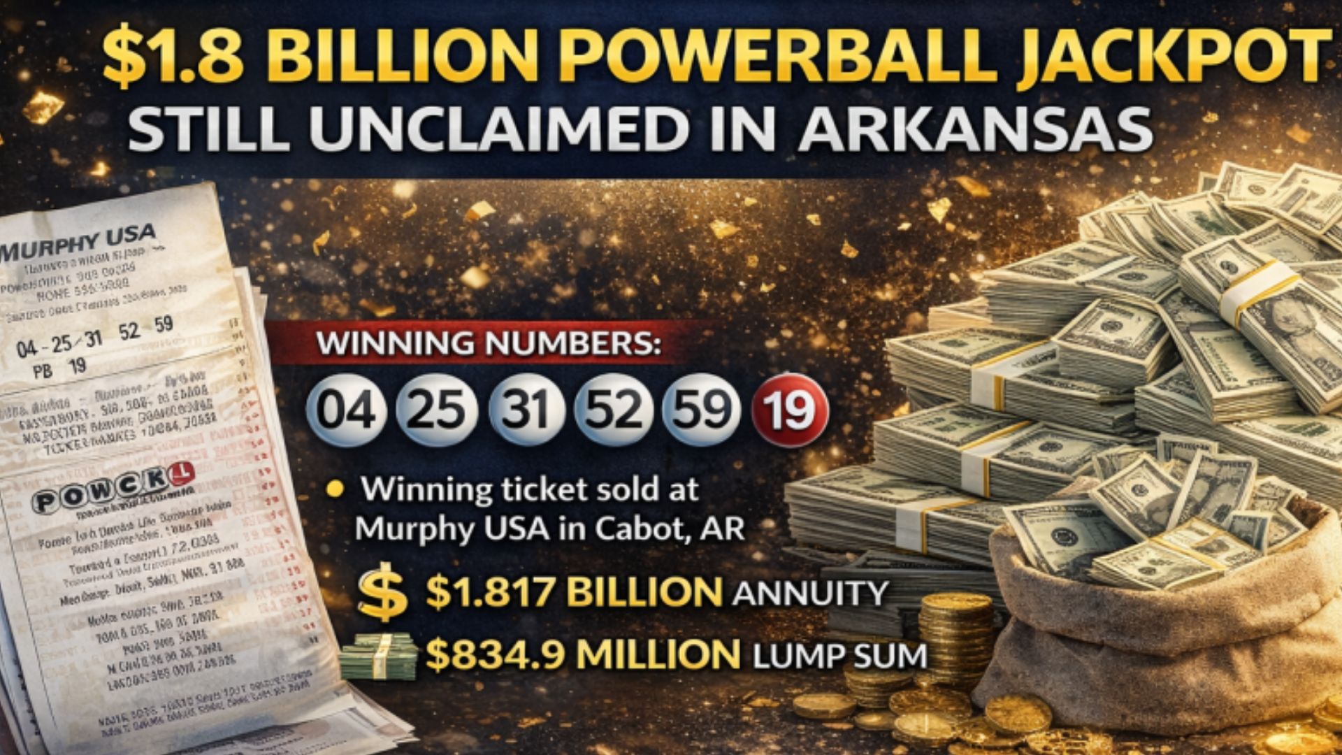 Little Rock, Arkansas – A record-breaking $1.817 billion Powerball jackpot sold in Arkansas on Christmas Eve remains unclaimed more than two weeks after the drawing, leaving lottery officials and the public eager to see who will come forward to claim the life-changing prize. The winning ticket, purchased at a Murphy USA gas station in Cabot, Arkansas, has sparked nationwide attention, with residents double-checking their tickets and the countdown to the prize claim deadline now underway.